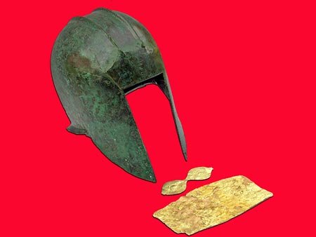 Οι αρχαϊκές ταφές. Το χάλκινο κράνος, το χρυσό «εποφθάλμιο» και το χρυσό επιστήθιο.