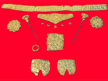 Οι πλούσιες γυναίκες έφεραν χρυσά στέμματα ή χρυσά, δερμάτινα ή υφασμάτινα με επικολλημένους χρυσούς ρόδακες ταινιωτά διαδήματα, χρυσoύς σφηκωτήρες, χρυσές «σύριγγες», χρυσά ενώτια (ταινιωτά με άνθος στο άκρο τους ή αργυρά σχήματος ωμέγα), καθώς και χρυσά προσωπεία. Το στόμα των γυναικών καλυπτόταν με χρυσό επιστόμιο, στις περιπτώσεις που δεν υπήρχε προσωπείο. Σε μερικές ταφές, η παρουσία του χρυσού επιστομίου, αλλά και του χρυσού ομοιώματος οφθαλμών με διακόσμηση οφθαλμών ή ροδάκων επιβεβαιώνουν ότι αυτά υποκαθιστούσαν τα προσωπεία. Τα περιδέραια στις πλούσιες ταφές κατασκευάζονται από χρυσές, αργυρές, κεχριμπαρένιες, φαγεντιανές ή γυάλινες χάντρες. Τα χρυσά ή αργυρά περίαπτα είναι σφαιρικά, κωνικά, κυλινδρικά, πυραμιδωτά, αγγειόσχημα κτλ. Τα ενδύματα διακοσμούνταν με χρυσά, αργυρά, χάλκινα, σιδερένια και οστέινα κοσμήματα (αλυσίδες, περόνες, πόρπες, ρόδακες, ταινίες και ελάσματα), με γυάλινες και φαγεντιανές χάντρες, τα χέρια με βραχιόλια και δακτυλίδια, ενώ τα υποδήματα χρυσούς ρόδακες και ελάσματα.
