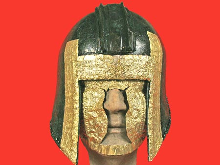Οι ανδρικές ταφές. Το χρυσό προσωπείο και το χάλκινο κράνος του πολεμιστή του τάφου.